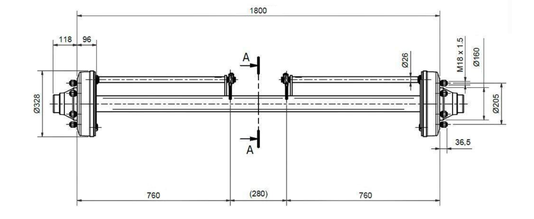 AKSEL TIL TRAILER MED BREMSER (6 SKRUER) - 7200 kg - 1800 mm