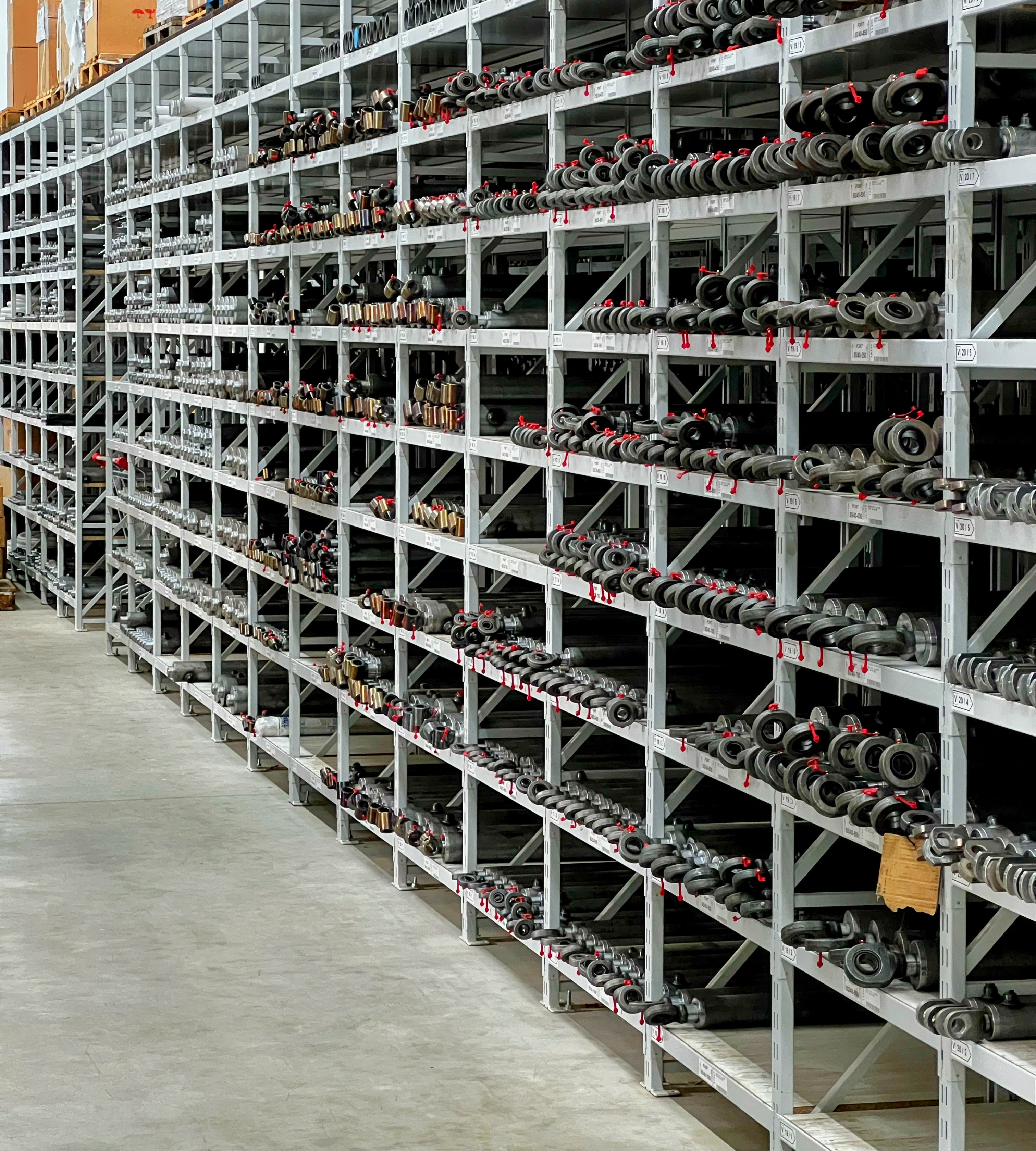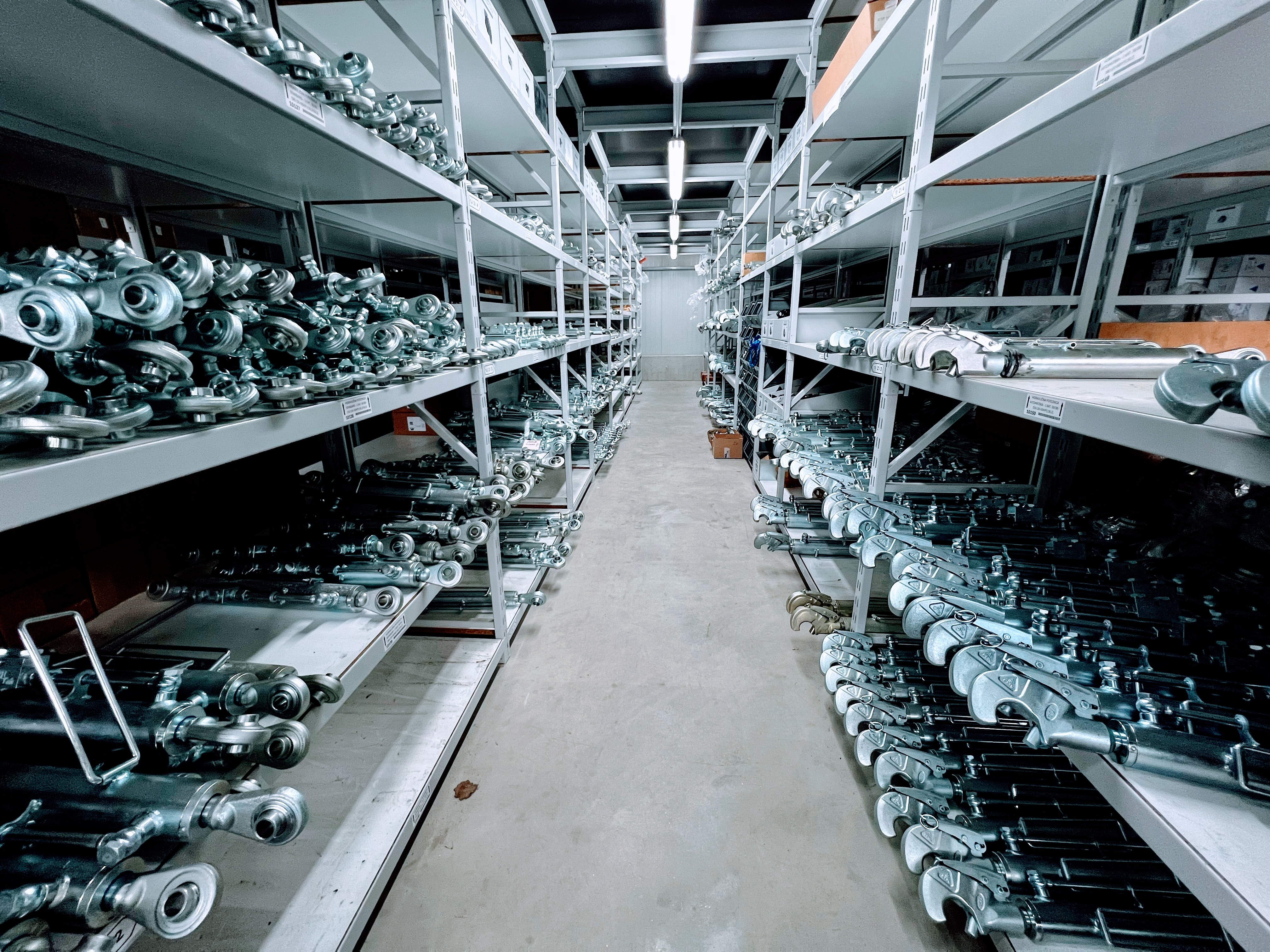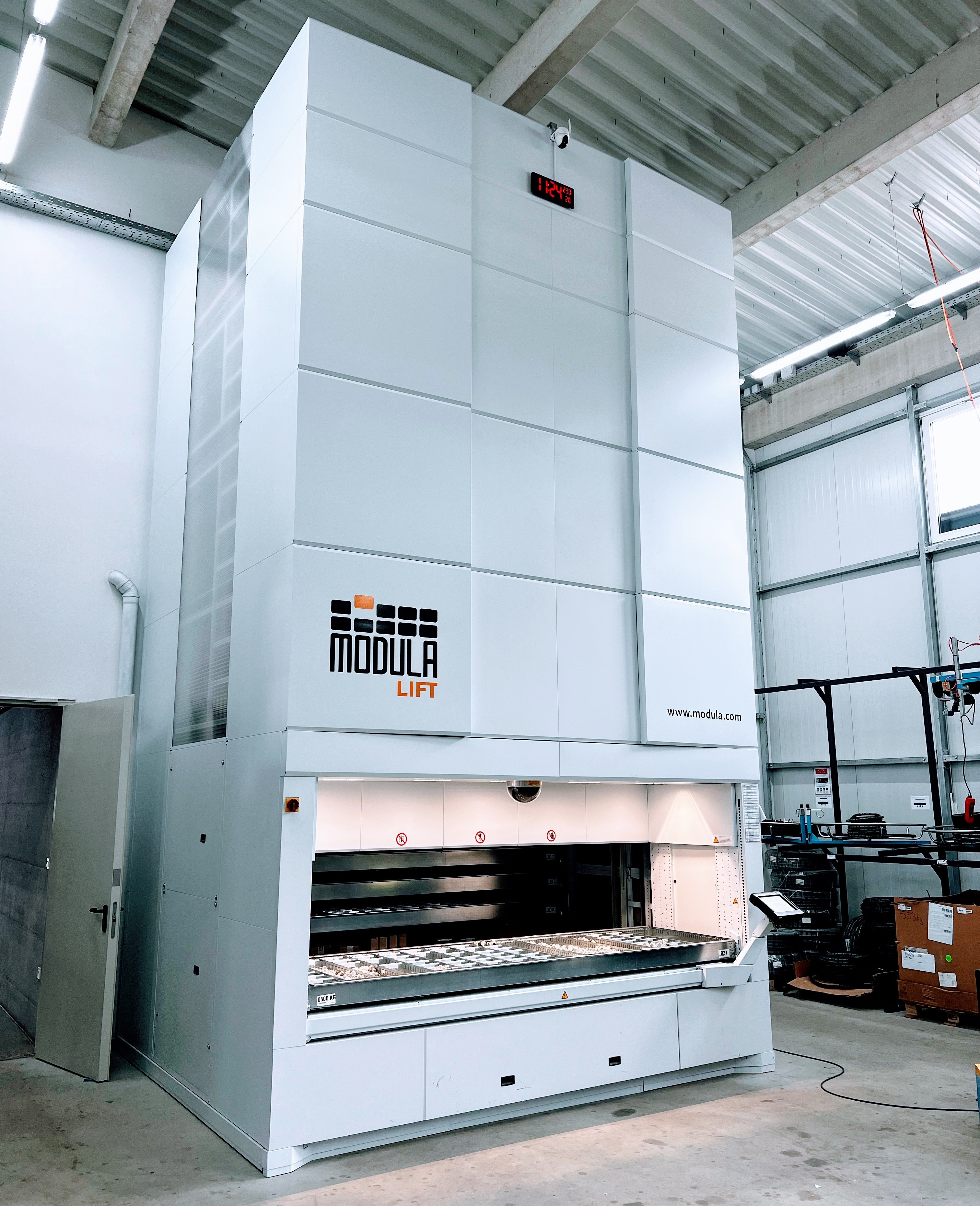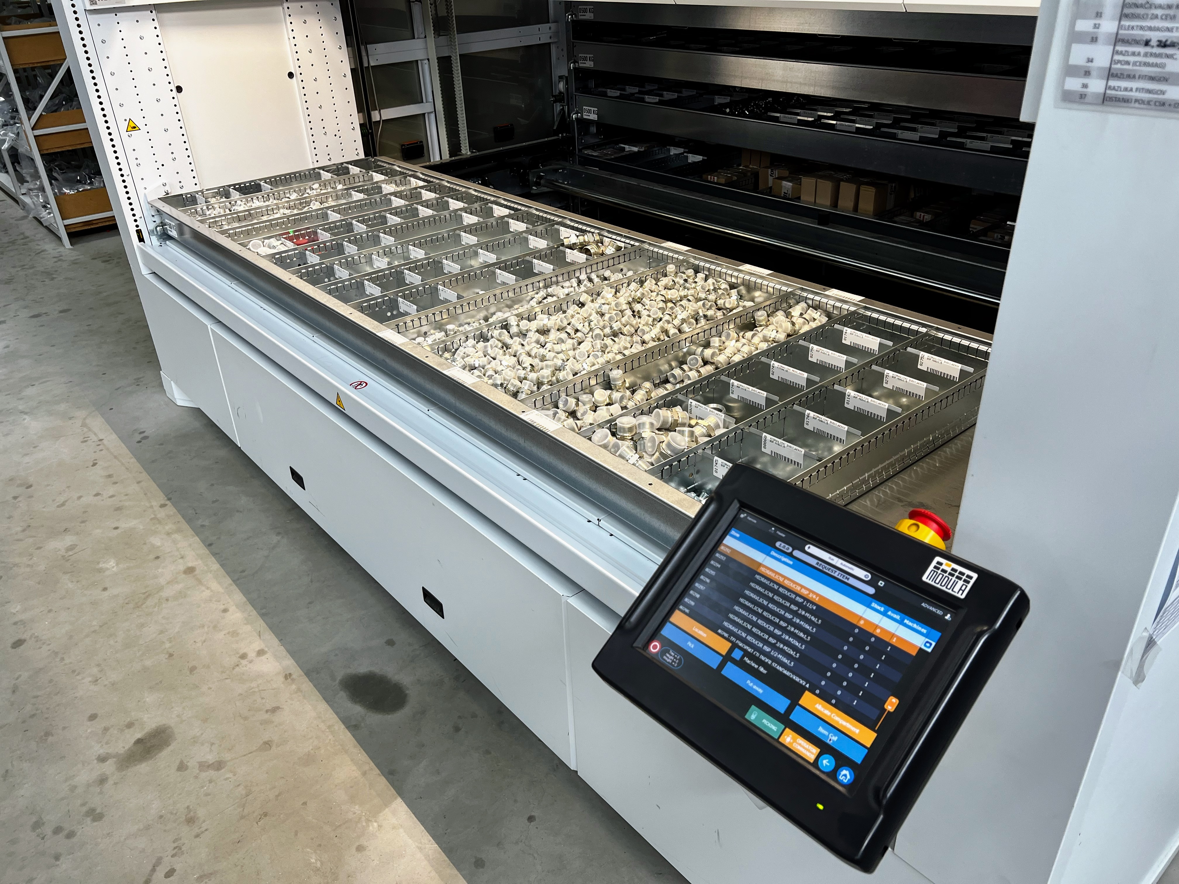 Za skladiščenje drobnega materiala smo ubrali še učinkovitejšo rešitev, t.i. “pametno skladišče” - Modula. Gre za veliko omaro, kamor se vstavijo regali oziroma pladnji, vanje pa se po številnih razdelkih po šifrah zložijo artikli. Na tak način lahko kdorkoli izmed naših zaposlenih na zaslonu na stroju vpiše šifro, Modula pa mu v nekaj sekundah dostavi pladenj, kjer se nahaja željeni artikel. Stroj na koncu razdelek v plasnju še osvetli z laserjem, tako da je izbira zelo hitra. Sistem je povezan tudi z razknjiževanjem, da nam zaloga v vsakem trenutku kaže prave vrednosti. Zadeva je za nas uporabna predvsem za fitinge, saj dnevno izdelamo veliko hidravličnih cevi po meri, ki imajo na vsaki strani različne priključke.