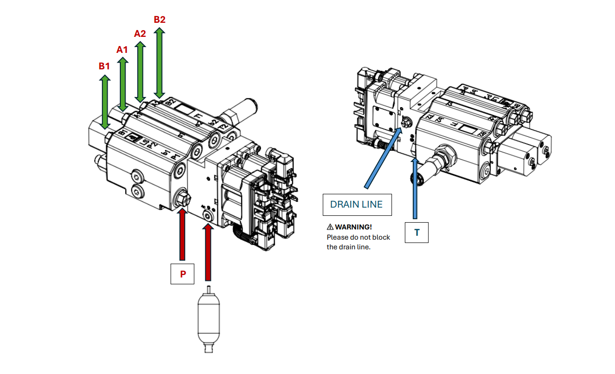 - Om du har två ventiler i hydrauliklinjen, koppla överföringsutgången från den första ventilen till tryckingången på den andra ventilen.