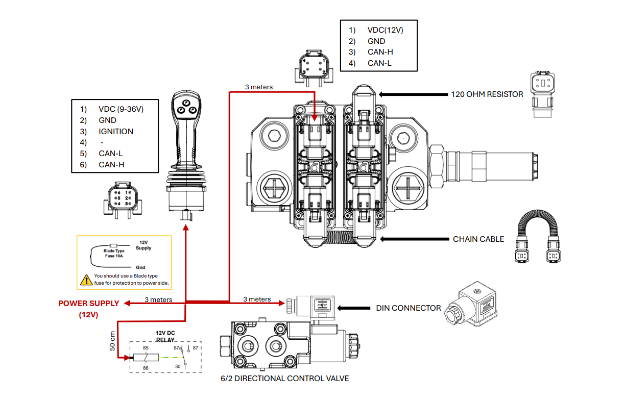 Setet inkluderar ventilen, en proportionell kontrolljoystick och elektrisk kabeldragning.
